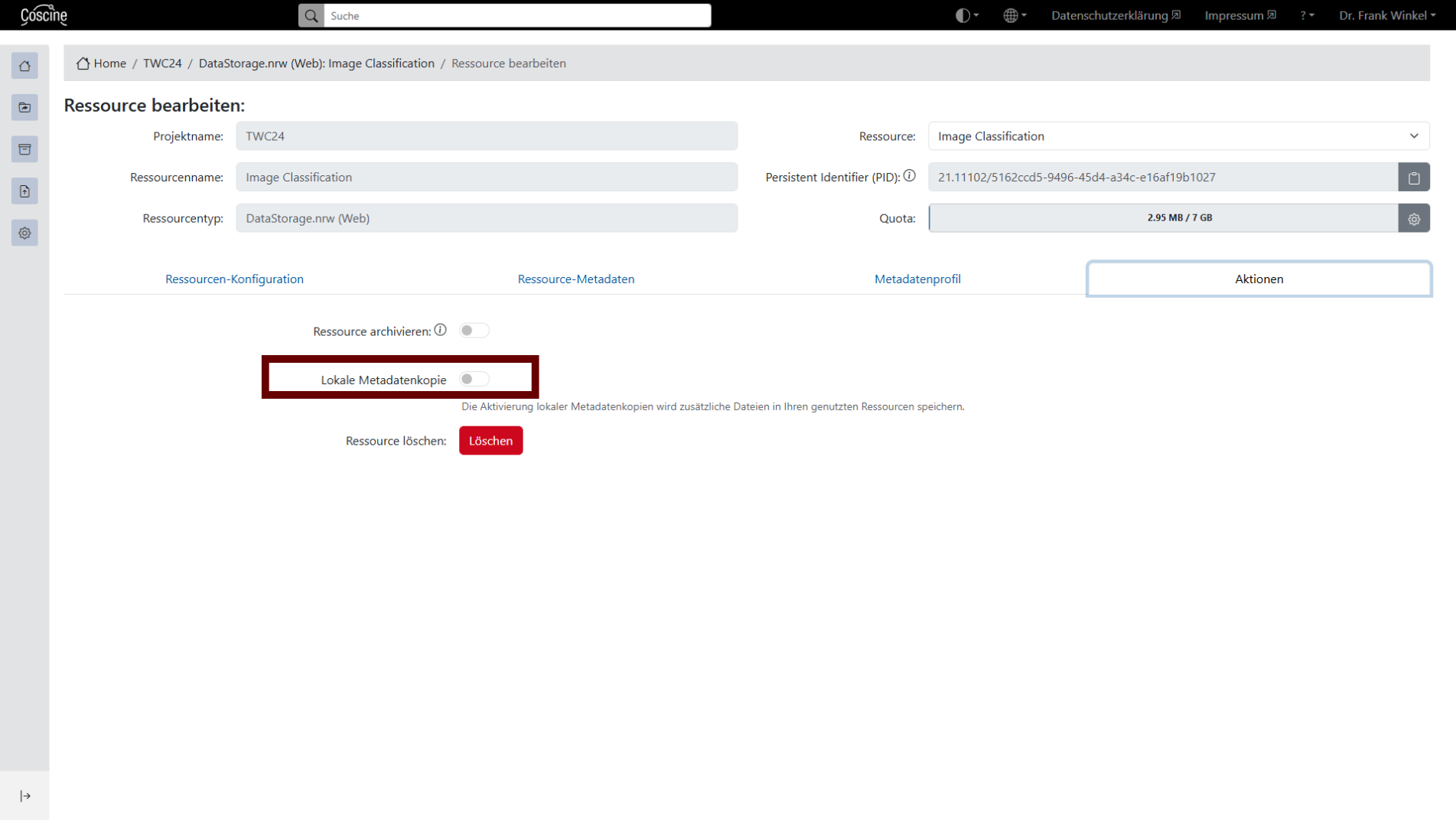 The activation for metadata copies is possible under resource settings and the Actions-Tab. The new function simplifies the taking/transferring of metadata.