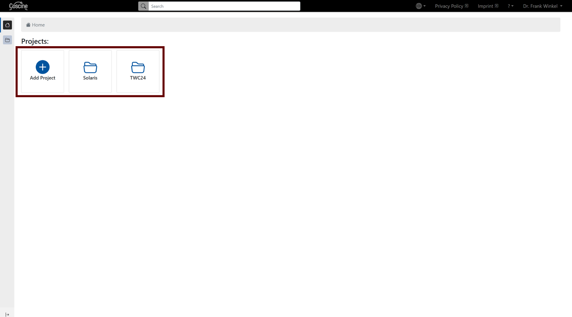 In Coscine data is organized within projects. This means that you always have to create a project first, to which you can then assign further members and add resources in a second step. You can recreate the tree-like structure of a large project by creating subprojects.