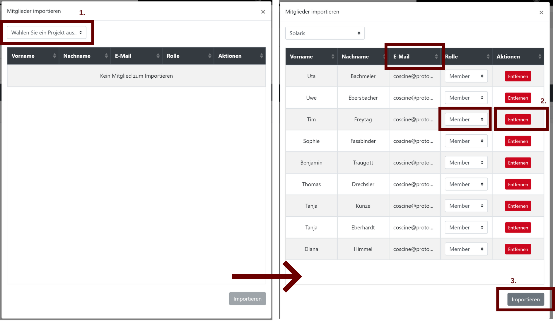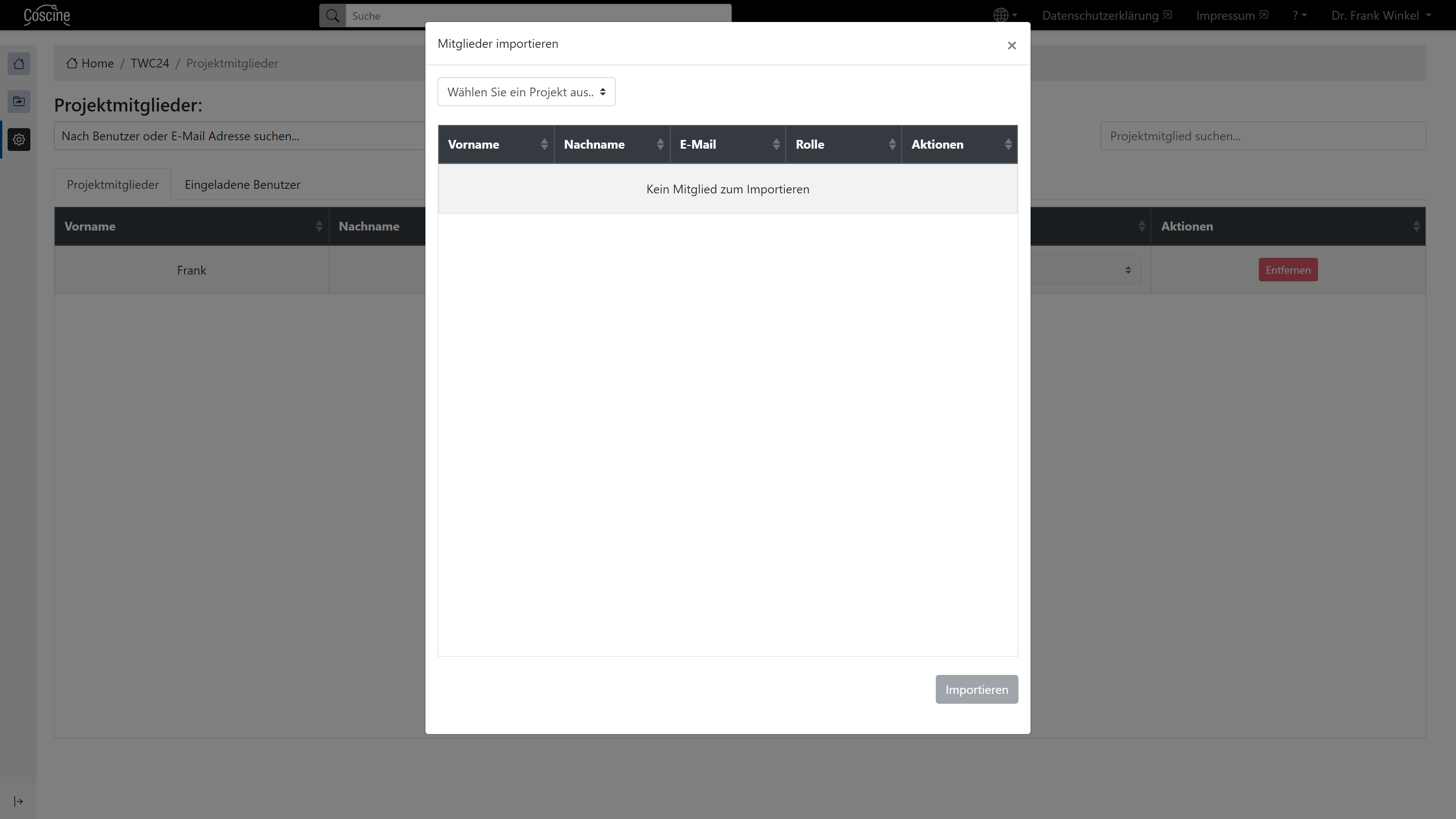 Using the import function, you can add multiple members to your project at the same time from existing (sub)projects (see Figure 2). In the member management, you call up this function via the Import button. In the window that now opens, you can use the drop-down list at the top left to select the project from which you want to add members. After selecting a project, the members from the respective project appear in the table. If you have a large number of members, the sorting function for names via the table header may helpful.