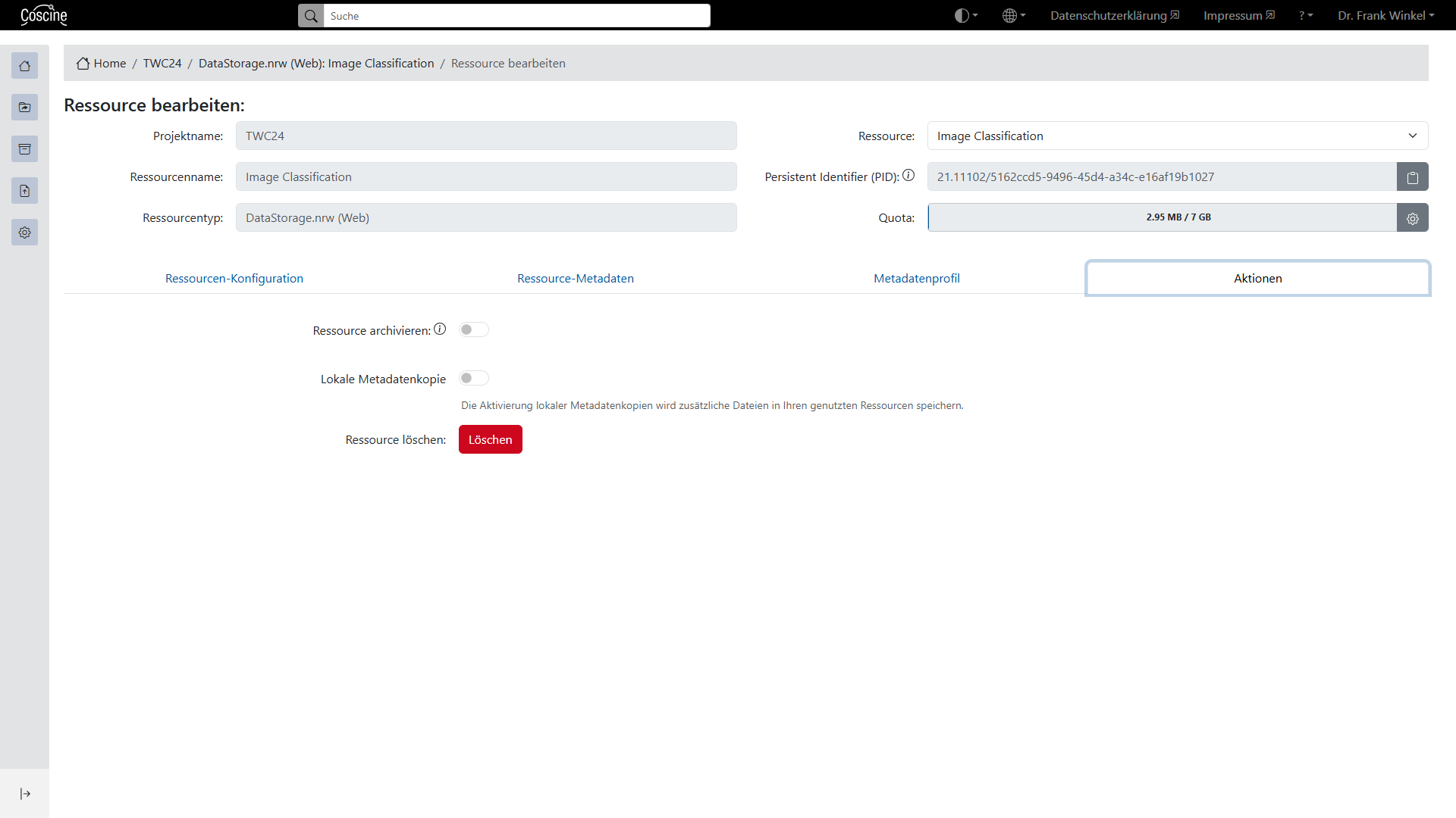 In the upper area of the resource configuration you can see the most important key data of your resource. This includes: Resource name, Display name, Resource Type, Persistent Identifier and Quota. Under "Quota" you can see the quota available to the resource in relation to the storage already used. You can switch to the project's quota management tool via the cogwheel next to the quota field.